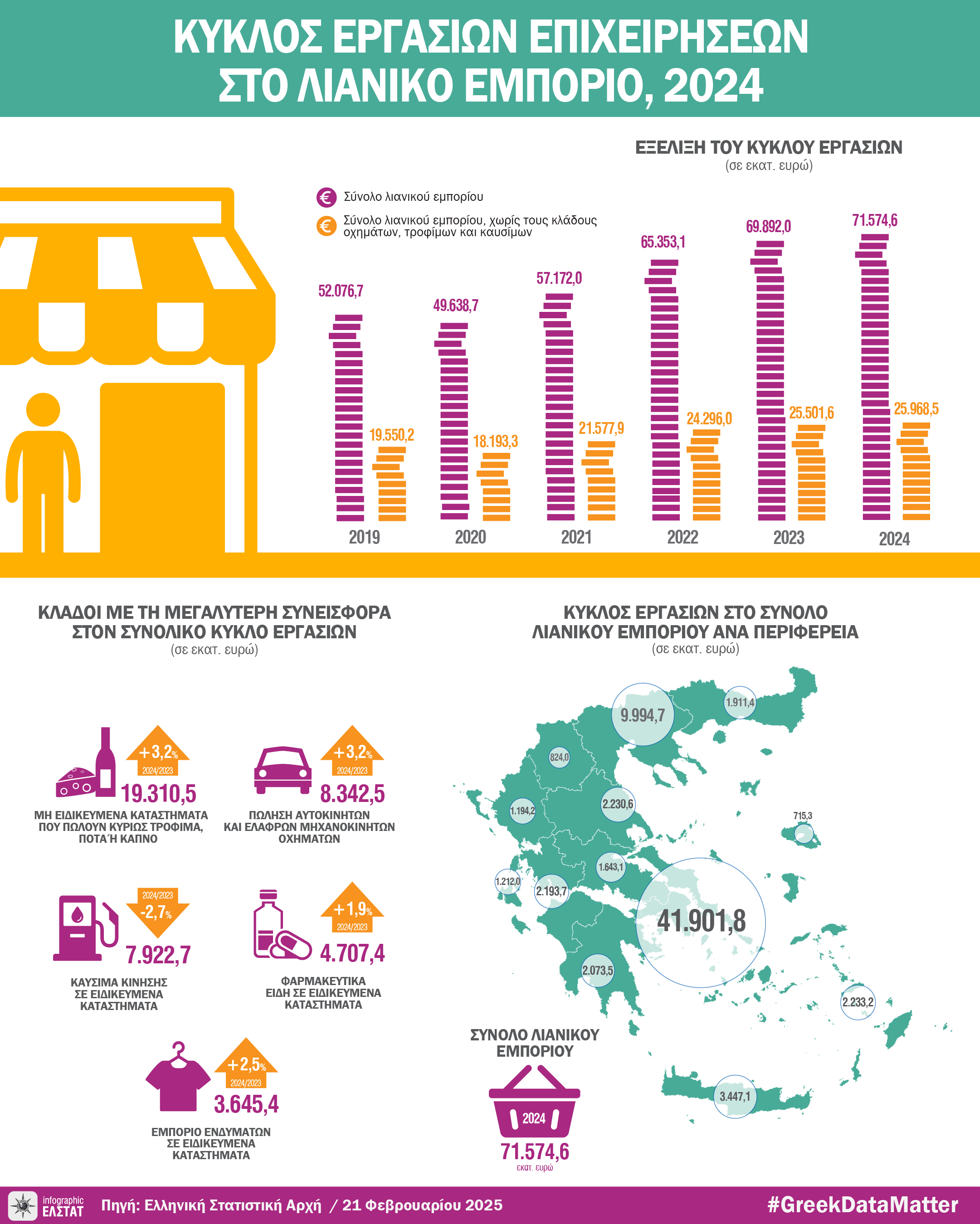 Η Ελληνική Στατιστική Αρχή (ΕΛΣΤΑΤ) ανακοινώνει την εξέλιξη Κύκλου Εργασιών Επιχειρήσεων Λιανικού Εμπορίου για το έτος 2024.