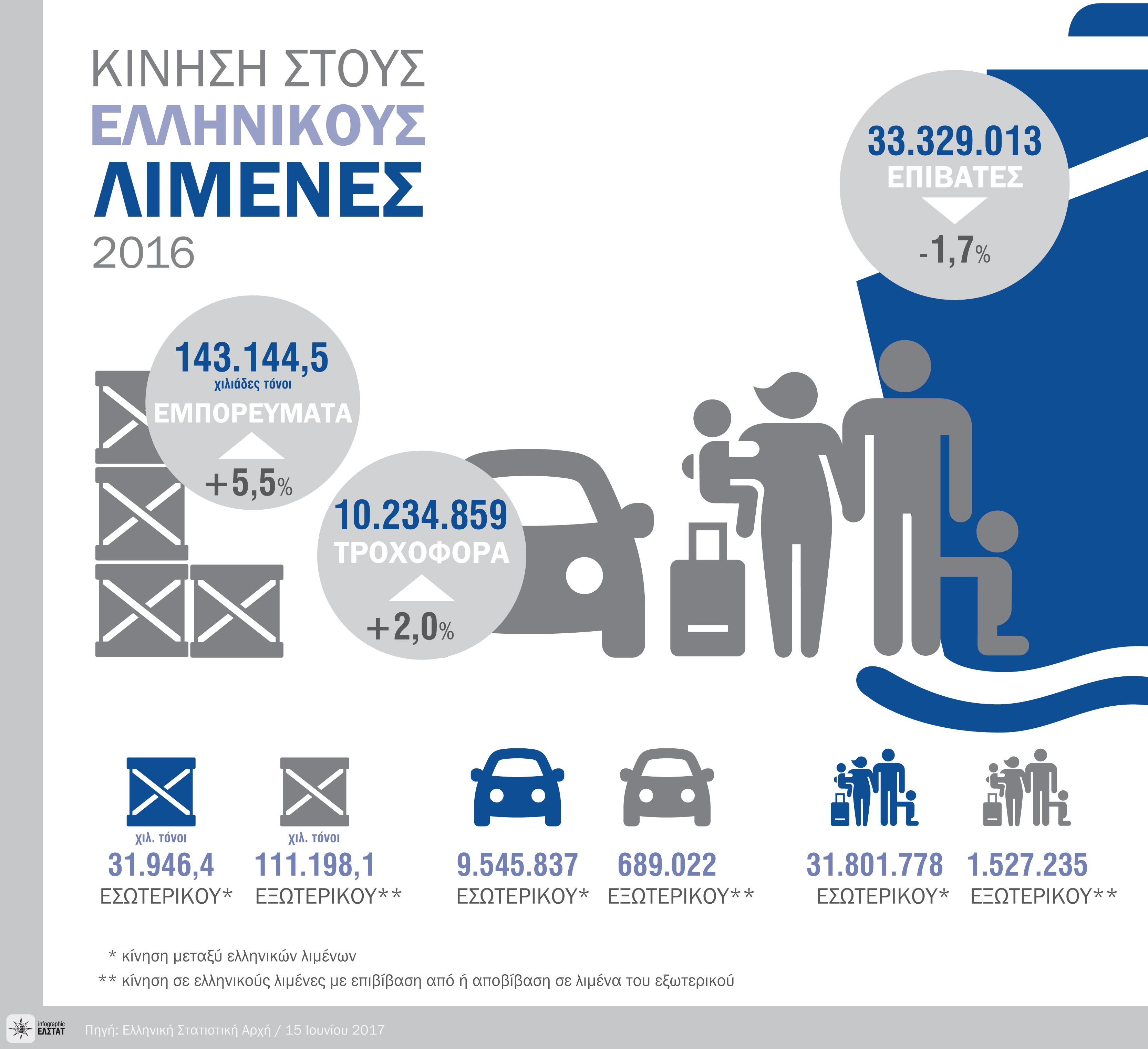 Η Ελληνική Στατιστική Αρχή (ΕΛΣΤΑΤ) ανακοινώνει τα αποτελέσματα διακίνησης επιβατών, εμπορευμάτων και κινητών μονάδων στους Ελληνικούς λιμένες του 2016.