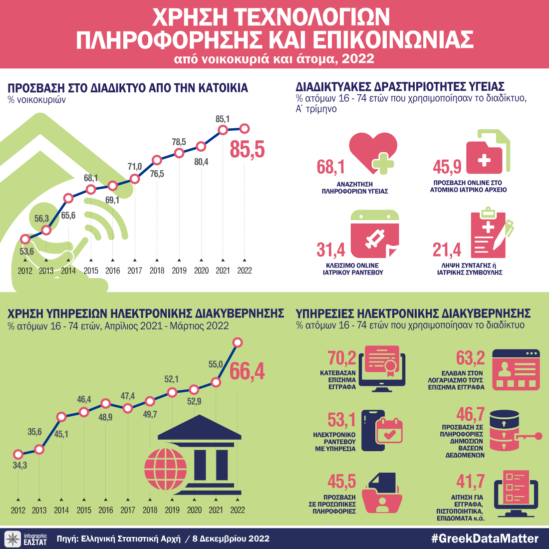 ΕΛΣΤΑΤ, Έρευνα Χρήσης Τεχνολογιών Πληροφόρησης και Επικοινωνίας από Νοικοκυριά και Άτομα. Ημερομηνία δημοσίευσης: 8.12.2022