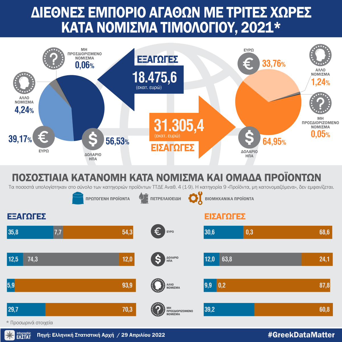 ΕΛΣΤΑΤ, Διεθνές Εμπόριο Αγαθών με Τρίτες Χώρες κατά Νόμισμα Τιμολογίου. Ημερομηνία δημοσίευσης: 29.4.2022