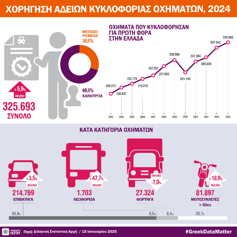 ΕΛΣΤΑΤ, Χορήγηση Αδειών Κυκλοφορίας Οχημάτων. Ημερομηνία δημοσίευσης: 15.1.2025