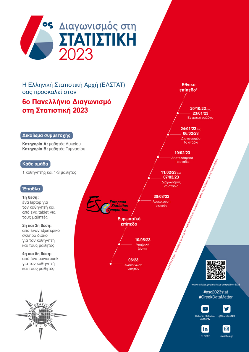 Η Ελληνική Στατιστική Αρχή (ΕΛΣΤΑΤ), στο πλαίσιο της στρατηγικής για την «Ανάπτυξη της Στατιστικής Παιδείας στην Ελλάδα», διοργανώνει, για έκτη φορά, τον «Πανελλήνιο Διαγωνισμό στη Στατιστική», με τη συγχρηματοδότηση της Ευρωπαϊκής Ένωσης.