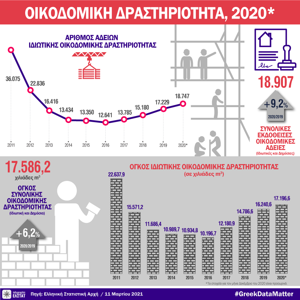 Η Ελληνική Στατιστική Αρχή (ΕΛΣΤΑΤ) ανακοινώνει τα στοιχεία Οικοδομικής Δραστηριότητας για το έτος 2020.