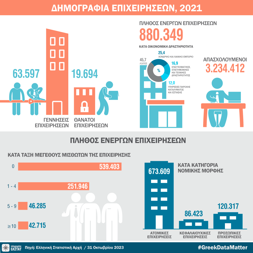 Από την Ελληνική Στατιστική Αρχή (ΕΛΣΤΑΤ) ανακοινώνονται τα αποτελέσματα της Έρευνας Δημογραφίας Επιχειρήσεων έτους 2021