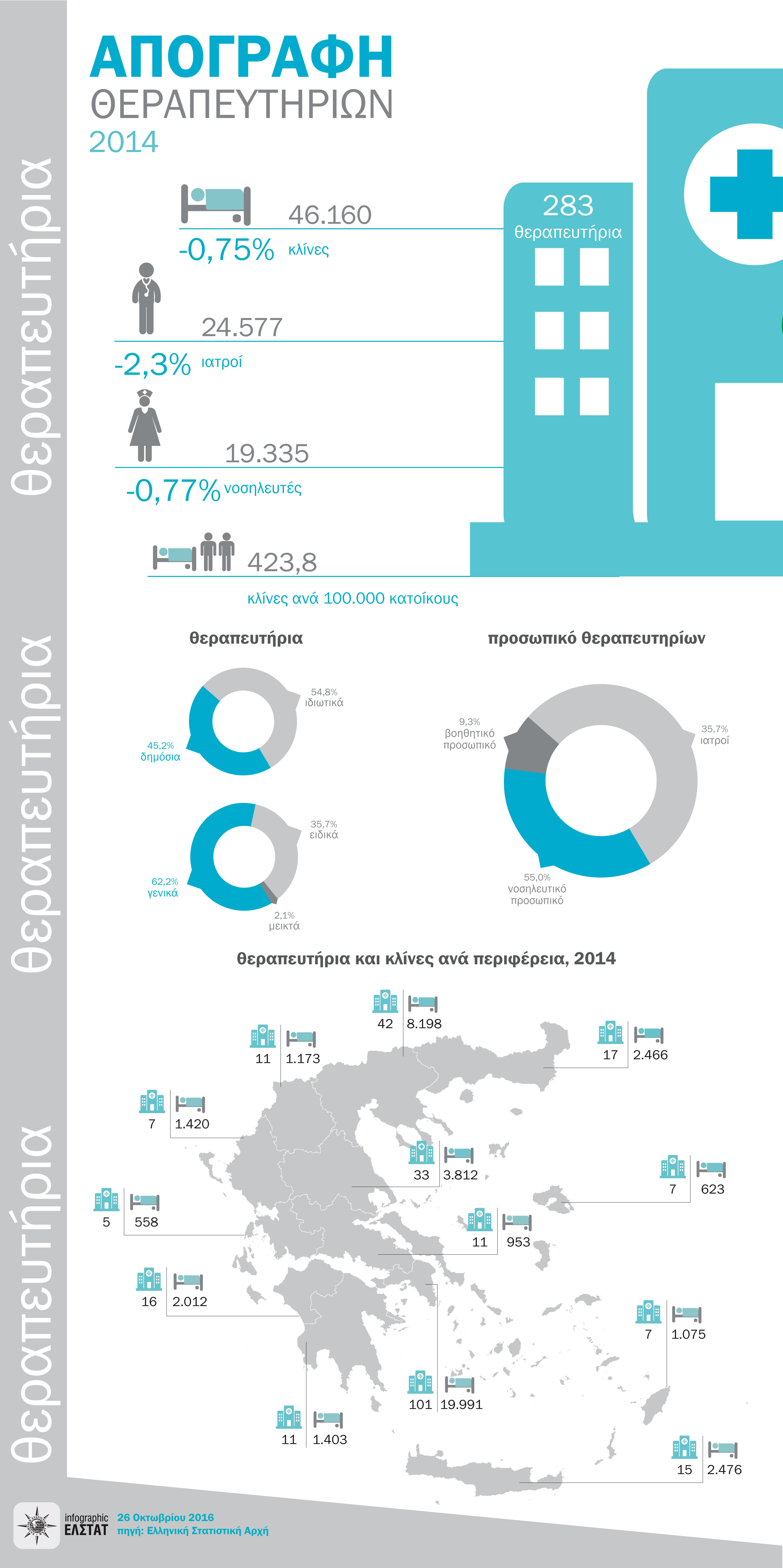 ΕΛΣΤΑΤ, Παρακολούθηση Θεραπευτηρίων της χώρας. Ημερομηνία δημοσίευσης: 26.10.2016