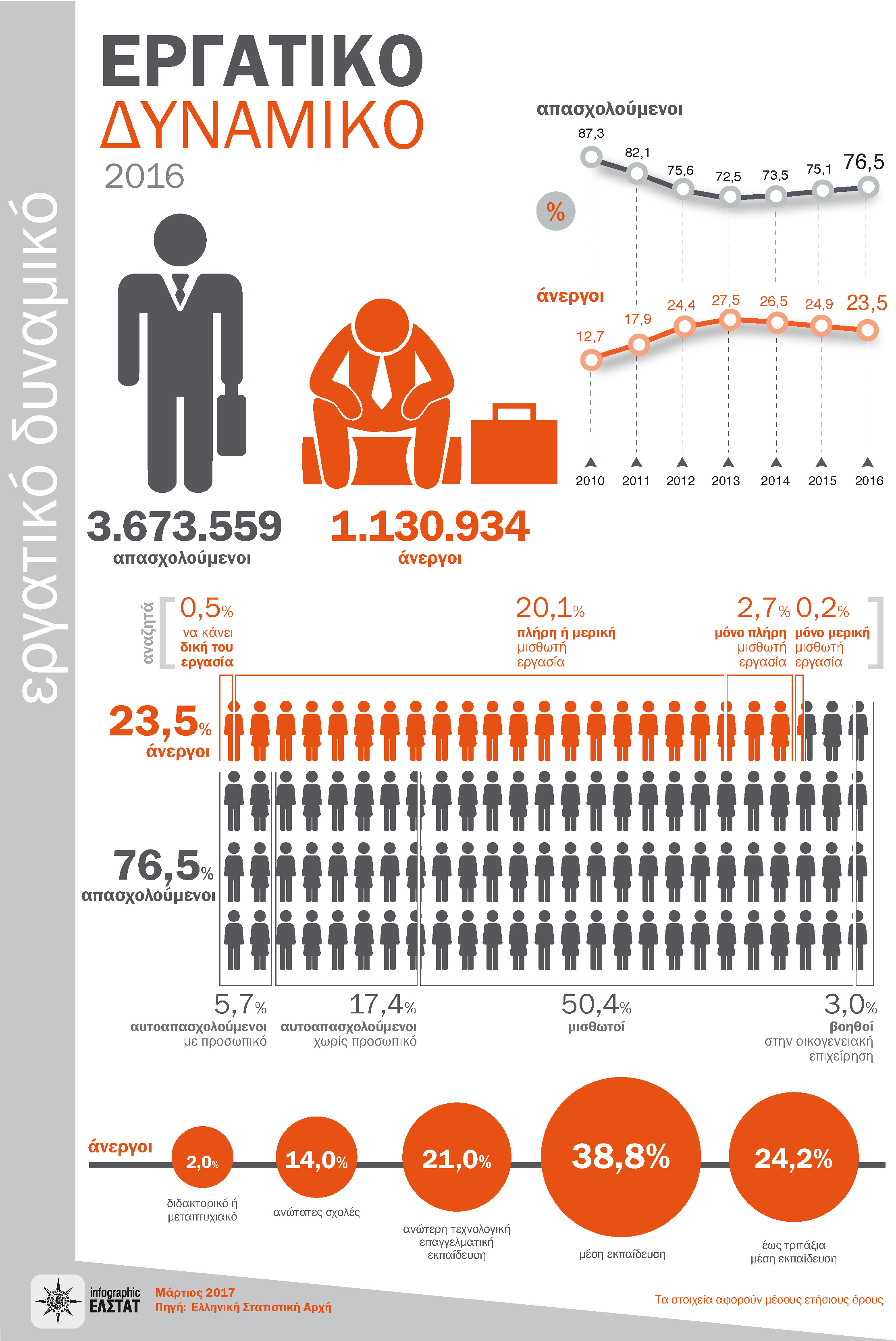 Η Ελληνική Στατιστική Αρχή (ΕΛΣΤΑΤ) ανακοινώνει τα αποτελέσματα της τριμηνιαίας Έρευνας Εργατικού Δυναμικού για το 4ο τρίμηνο 2016.