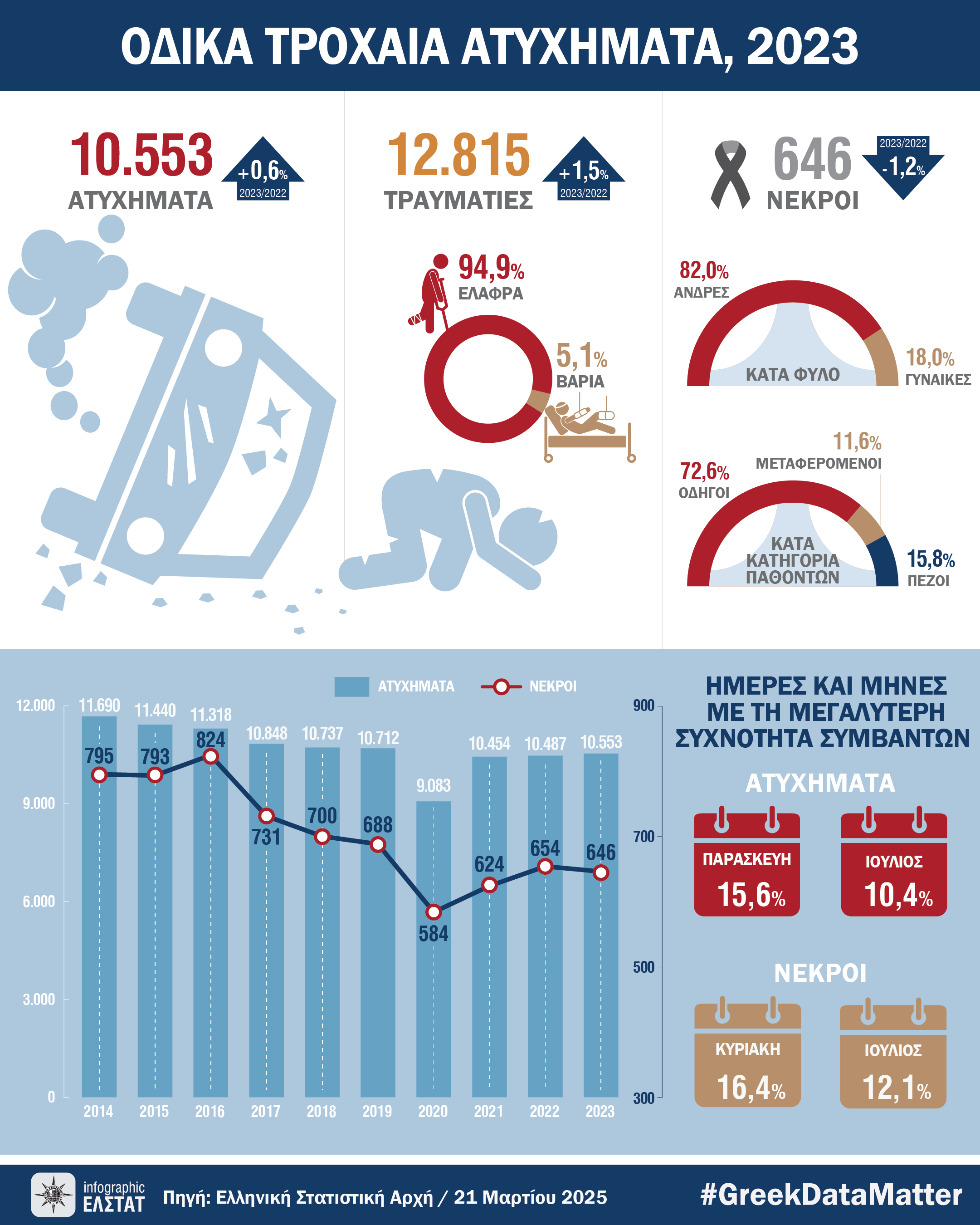Η Ελληνική Στατιστική Αρχή (ΕΛΣΤΑΤ) ανακοινώνει τα αποτελέσματα για τα Οδικά Τροχαία Ατυχήματα, έτους 2023.