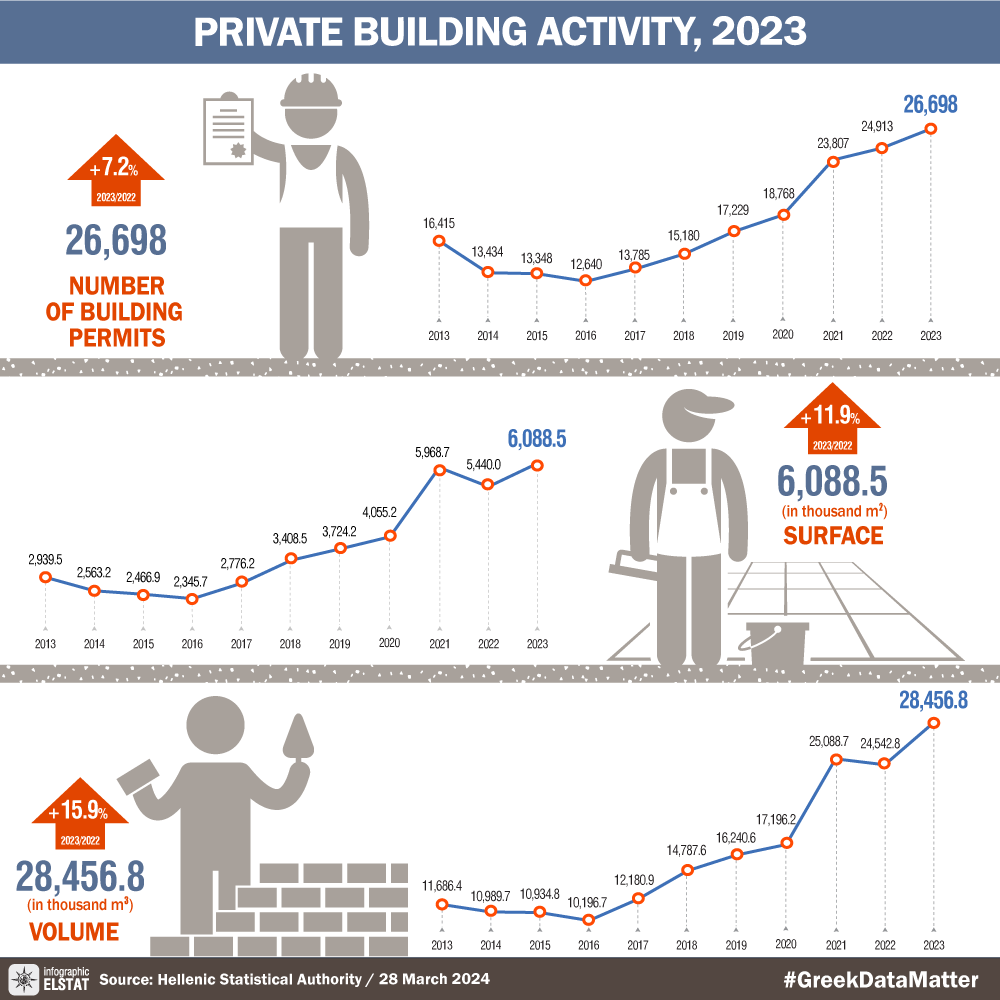 The Hellenic Statistical Authority (ELSTAT) announces the data of Building Activity Survey for the year 2023.
