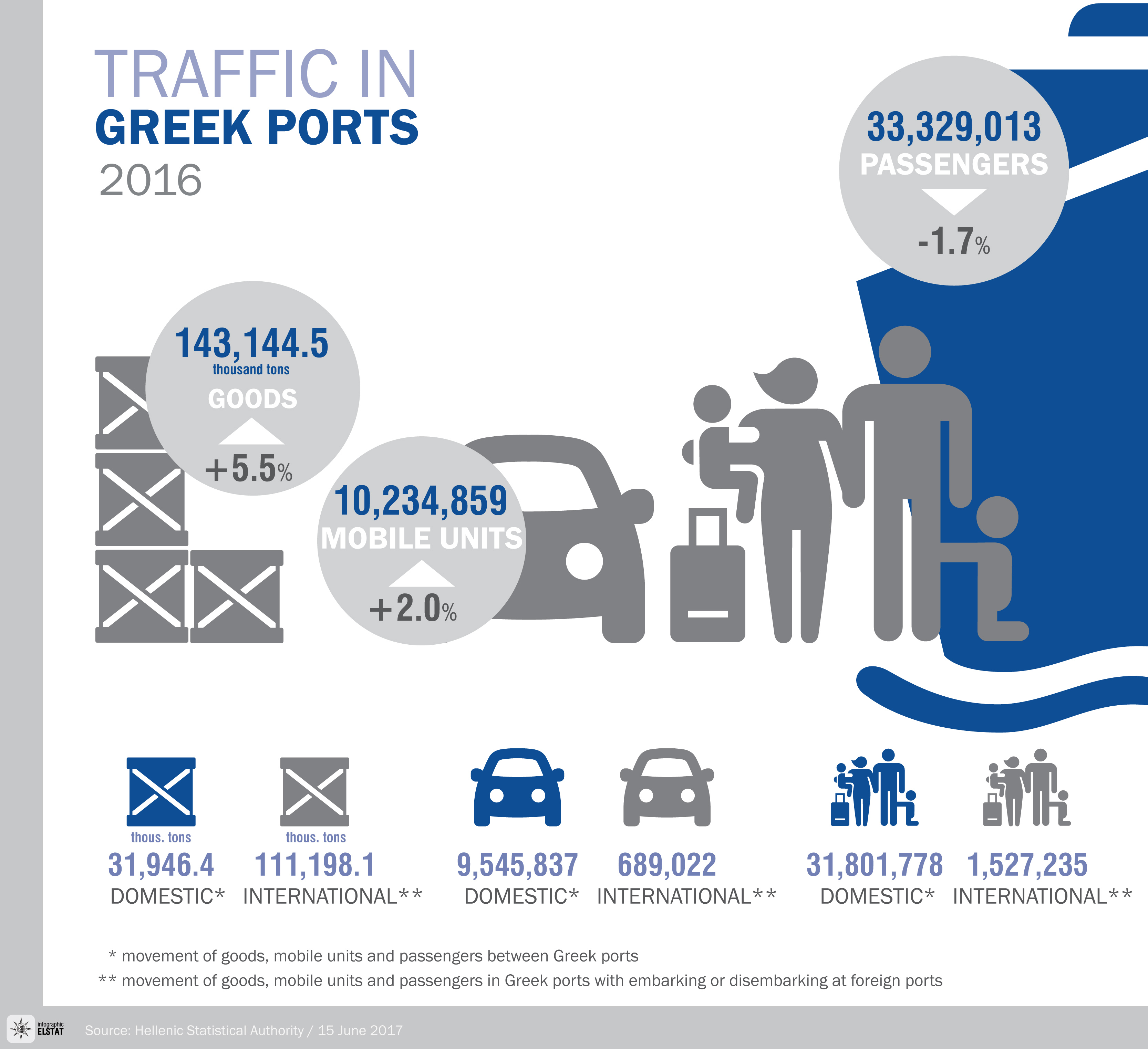 The Hellenic Statistical Authority (ELSTAT) announces data on traffic of passengers, goods and mobile units in the Greek ports for the year 2016.
