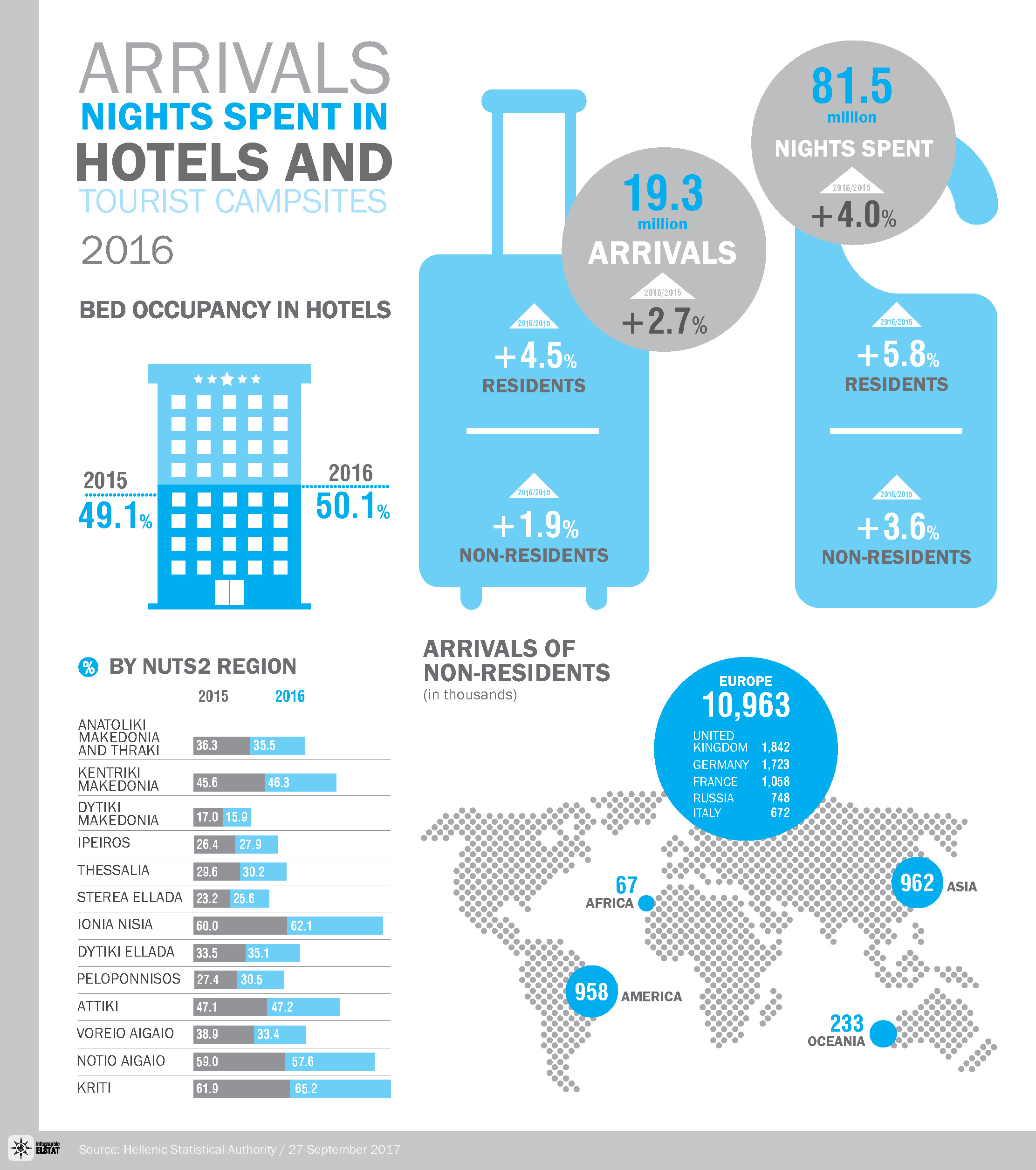 The Hellenic Statistical Authority (ELSTAT) announces the data of the Survey on arrivals and nights spent in hotels, similar establishments and tourist campsites, for the year 2016.