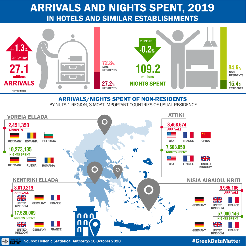 The Hellenic Statistical Authority (ELSTAT) announces the data of the Survey on arrivals and nights spent in hotels, similar establishments and tourist campsites, for the year 2019.