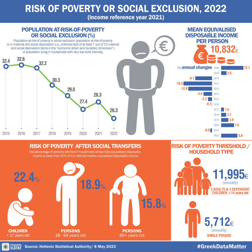 The Hellenic Statistical Authority (ELSTAT) announces data on the Risk of Poverty for the year 2022.