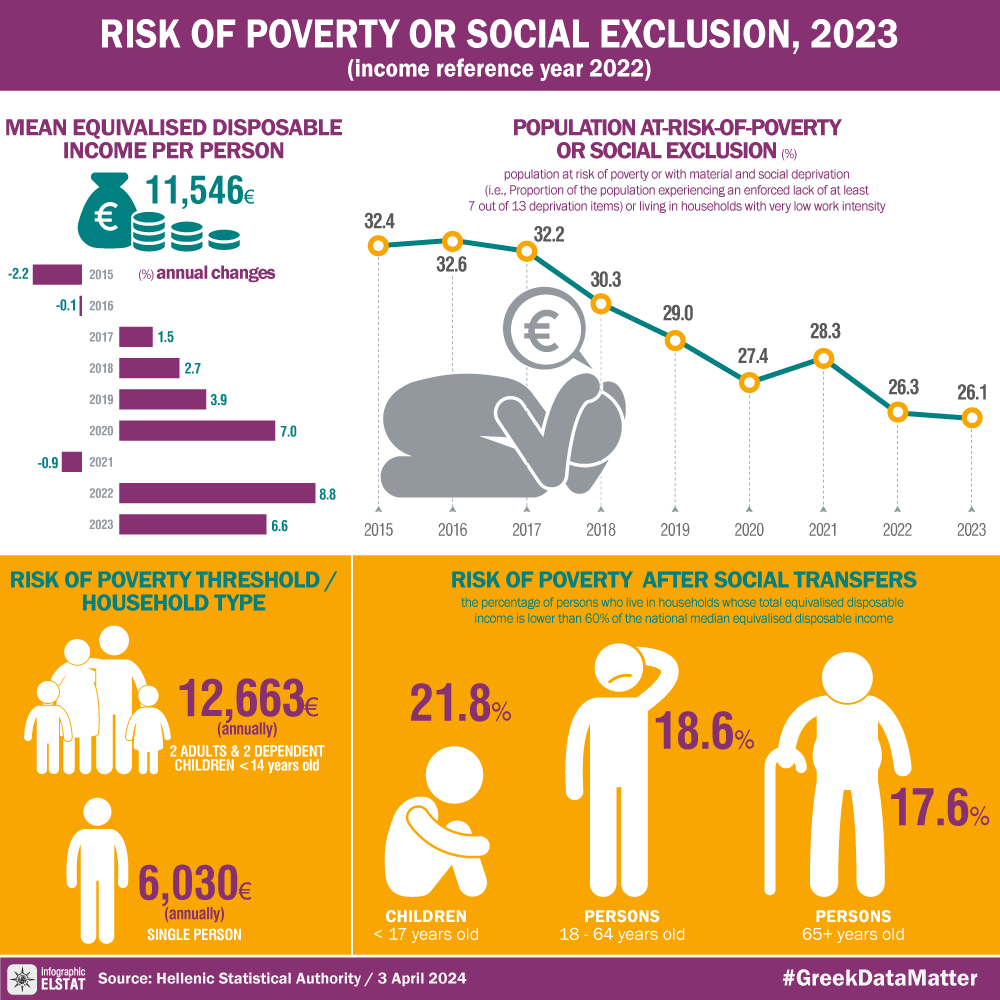 The Hellenic Statistical Authority (ELSTAT) announces data on the Risk of Poverty for the year 2023.